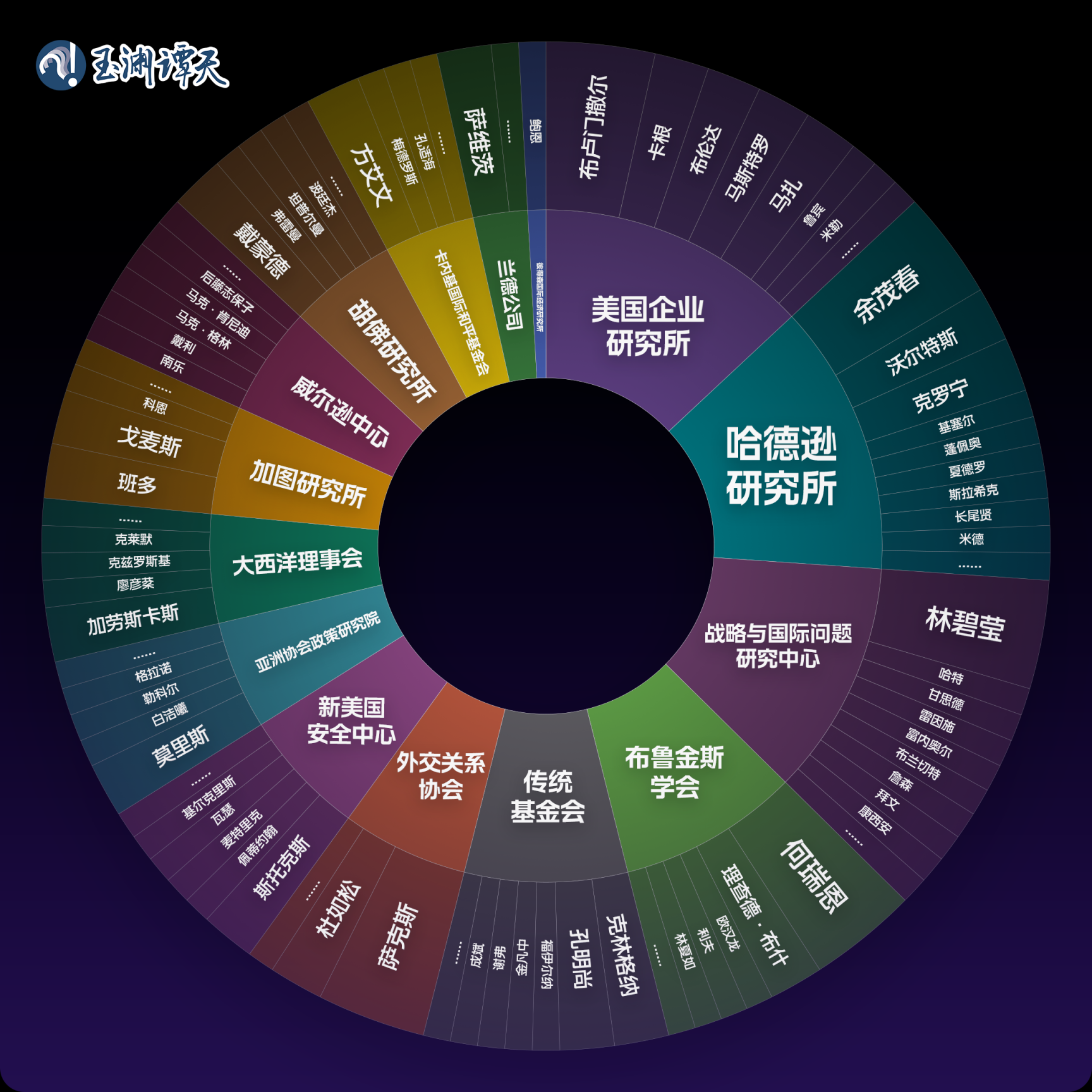 好意思国企业研究所,出奇是布卢门撒尔等东说念主 哈德逊研究所,出奇是余茂春、沃尔特斯、克罗宁等东说念主 政策与海外问题研究中心,出奇是林碧莹等东说念主 布鲁金斯学会,出奇是何瑞恩等东说念主排查他们与特朗普的关系后,谭主发现,多量智库和研究员,包括“态度中立”的政策与海外问题研究中心、社交关系协会,在畴前四年齐莫得和特朗普产生太多计议。