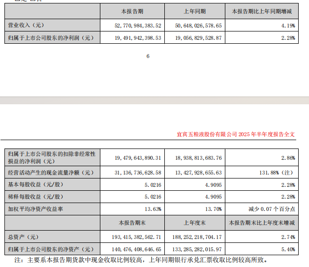 8月27日晚间,五粮液(000858.SZ)发布半年报,本年上半年公司兑现营收527.71亿元,同比增长4.19%;同期包摄于上市公司鼓吹的净利润为194.92亿元,同比增长2.28%;扣非后净利润为194.80亿元,同比增长2.86%;扫尾本年6月末,公司计算现款流净额311.37亿元,同比大增131.88%。
